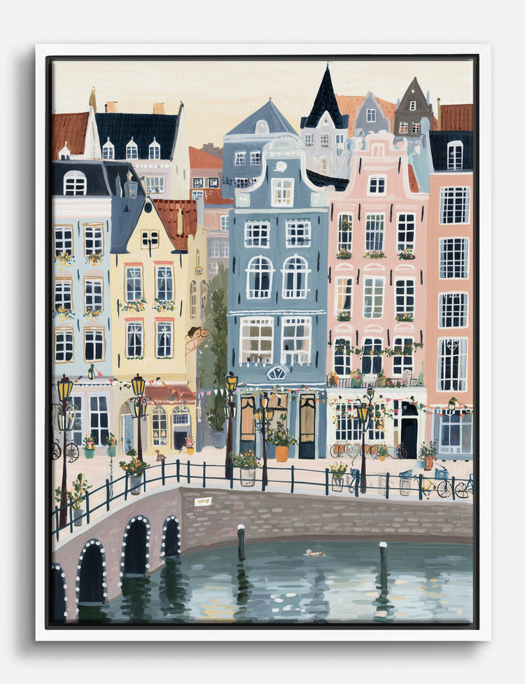 Step into the charm of canal-side living—no passport required. This piece captures the playful elegance of Amsterdam’s pastel townhouses, their whimsical facades mirrored in tranquil waters below.
