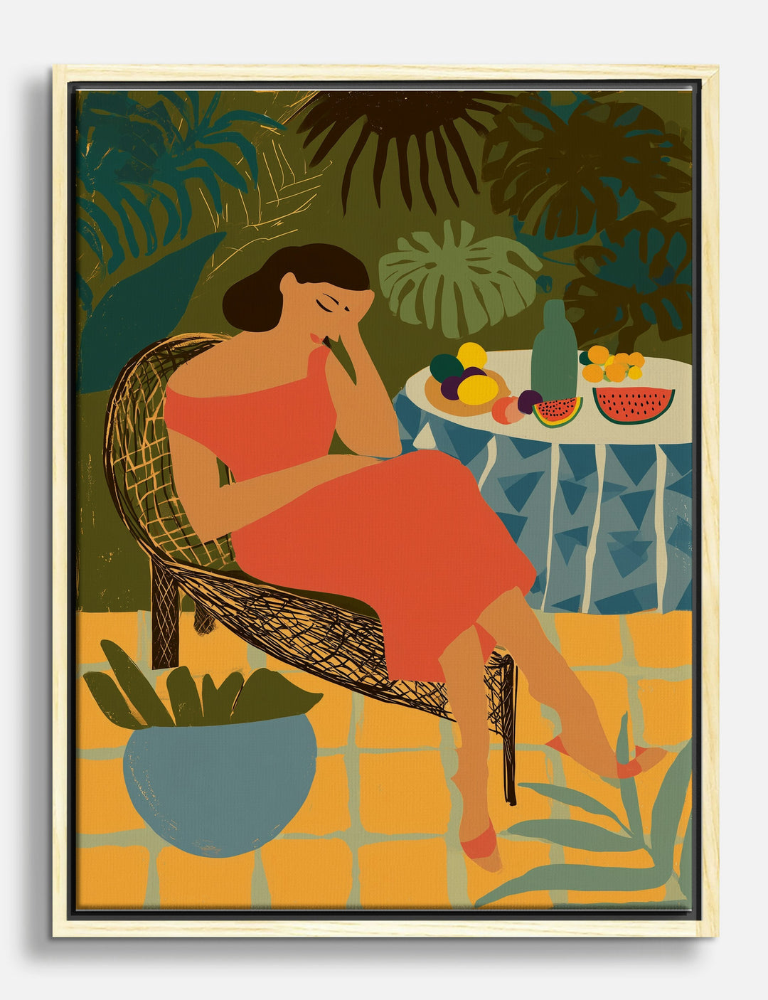 A warm afternoon, a quiet patio, and a moment just for you—this piece captures the art of slowing down. The woman in coral relaxes in her woven chair, surrounded by lush greenery and a table topped with summery fruit. It’s a scene that instantly softens any space and brings in a breath of effortless style.