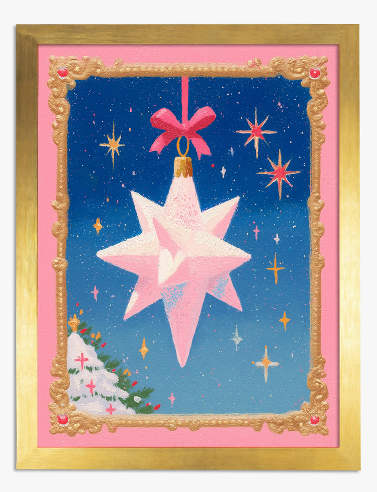 A shimmering pink star hangs front and center, ready to bring a dash of holiday magic to your space. This playful piece captures the wonder of the season with a dreamy palette of soft pinks, glimmering golds, and midnight blue. It’s like the feeling of your favorite ornament sparkling on a quiet night—pure joy, no assembly required.