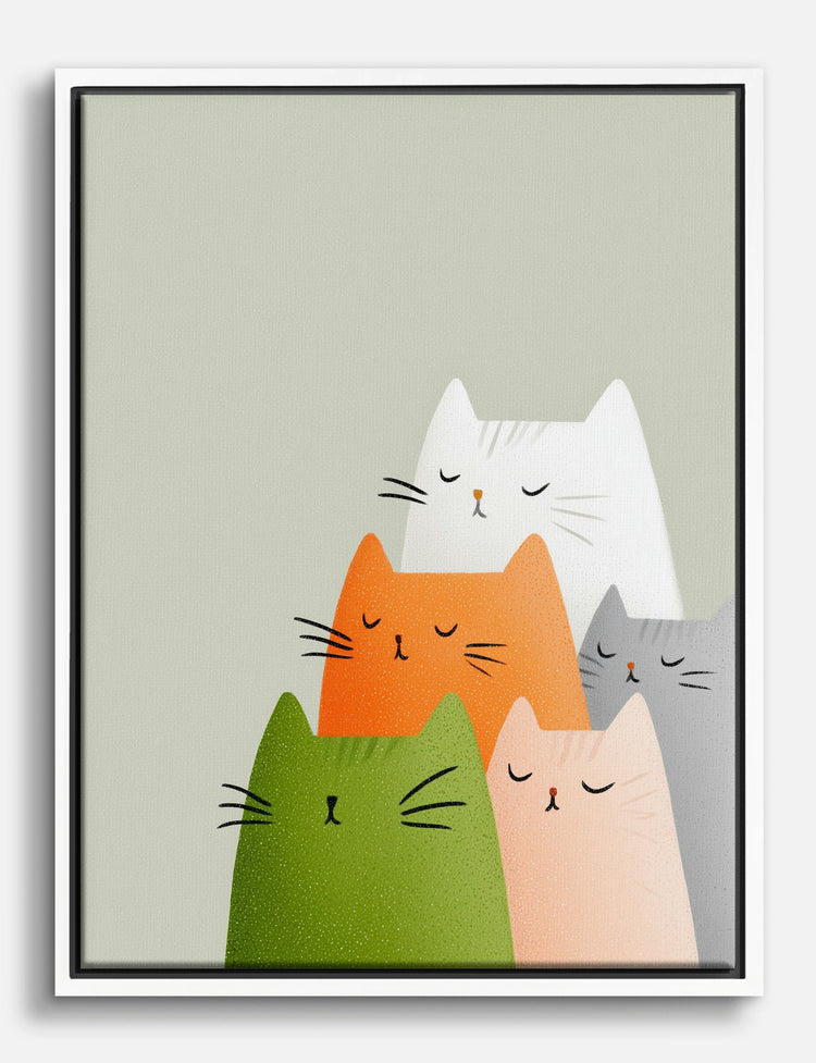 Five charming cats, each in a burst of cheerful color, gather together in this whimsical illustration. Their simple, content expressions bring instant warmth and lighthearted personality to your space.