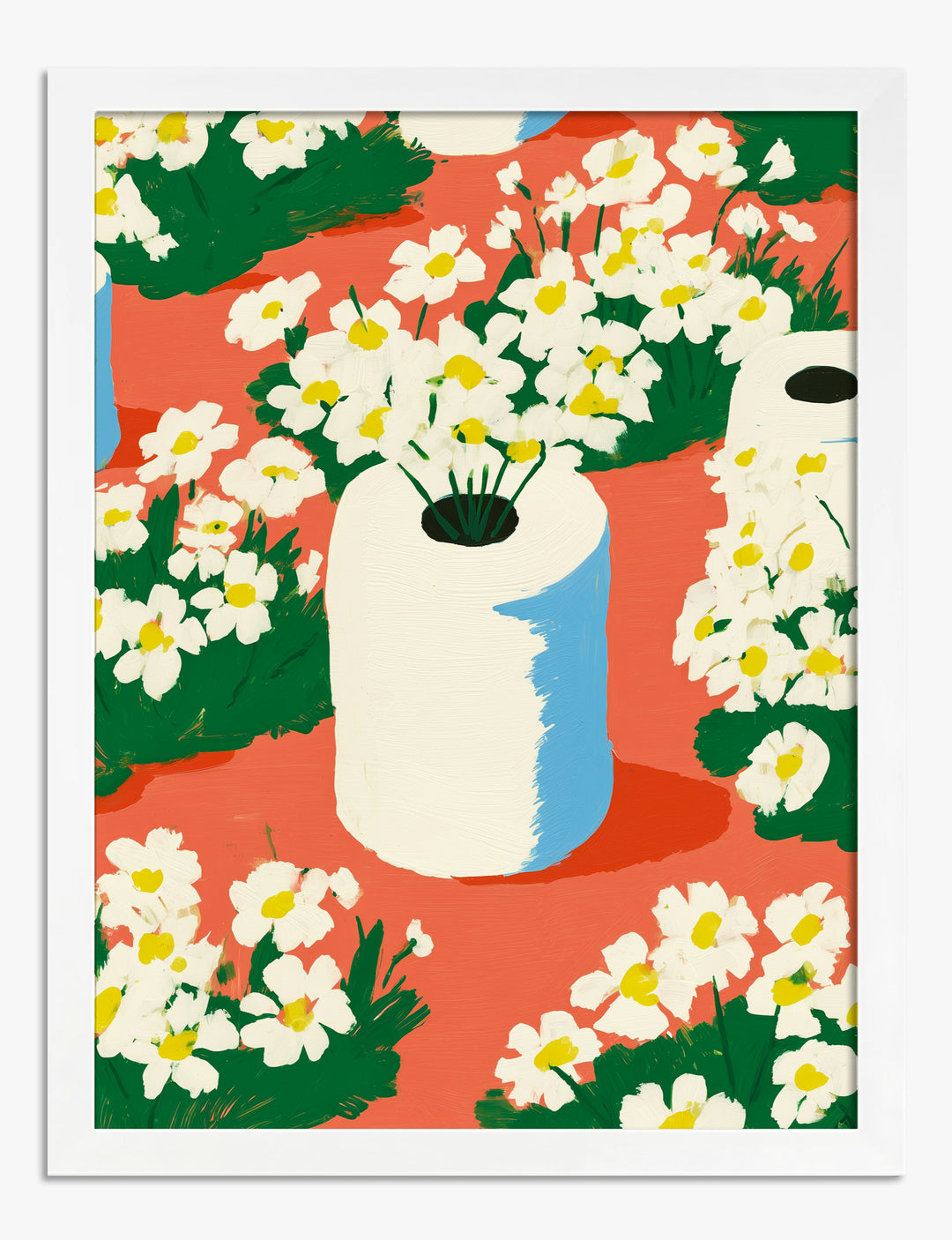 Unexpected and whimsical, this piece sets a playful tone with rolls of toilet paper nestled among blooming white flowers on a bold coral backdrop. It’s a cheeky nod to everyday moments, reimagined with style and humor.