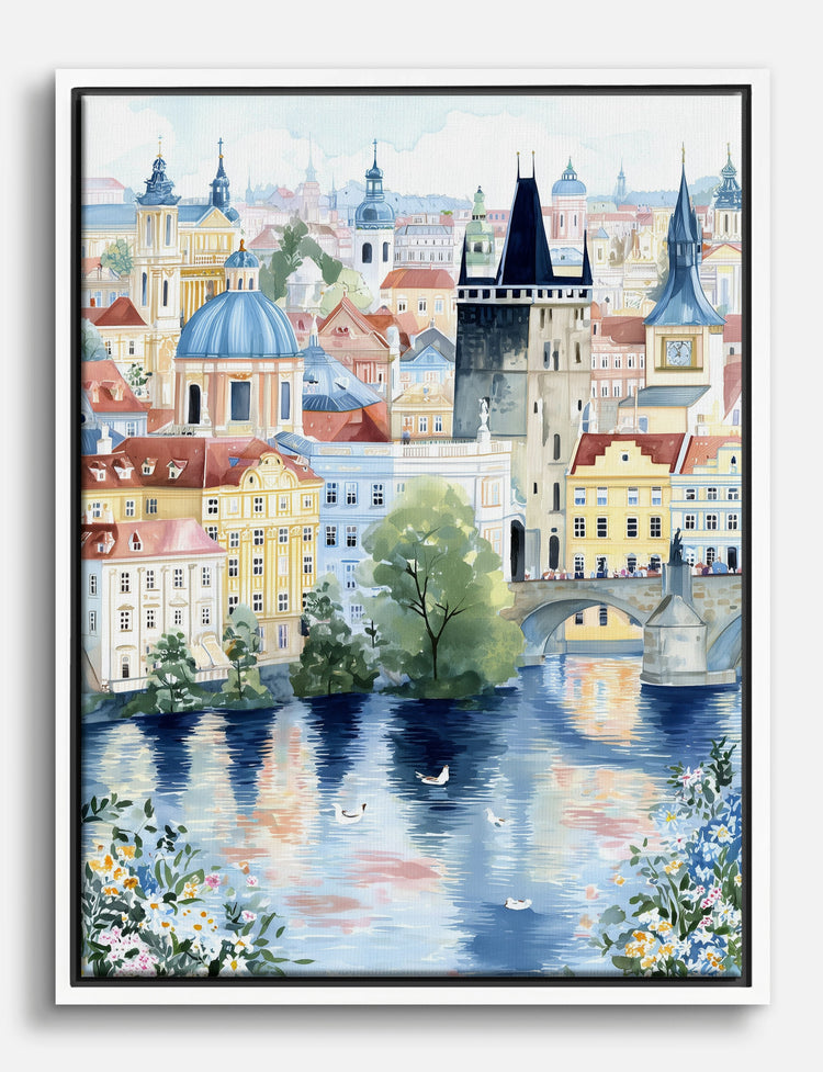 Soft pastel rooftops and dreamy reflections bring a sense of wanderlust right into your home. This vibrant cityscape captures the timeless romance of Prague, letting you bask in European charm without ever leaving your sofa.