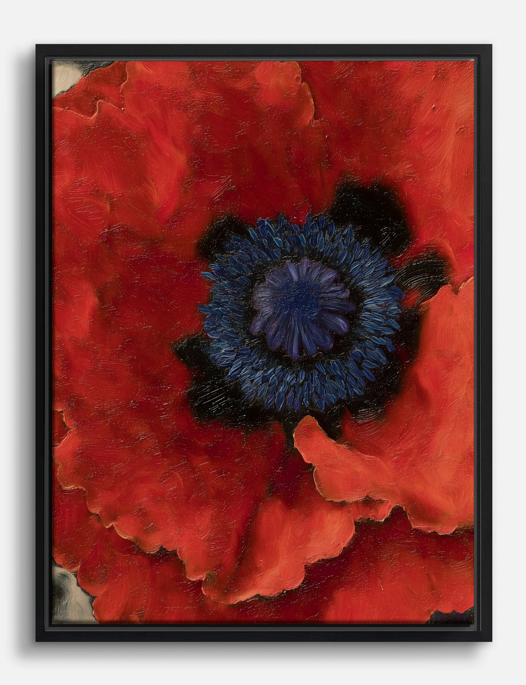 Step right up to bold beauty—this striking red poppy bursts with energy and confidence. The rich, velvety petals and dramatic blue-black center create a stunning focal point that instantly enlivens any wall.