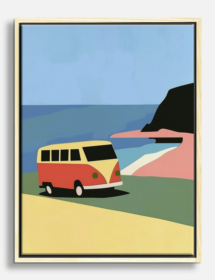 Feel the freedom of the open road with this vibrant retro van cruising by the seaside. Perfect for your living room or study, this piece brings a splash of adventure and nostalgia to any space. The bold color palette effortlessly complements modern and vintage decor, sparking joy and inspiring wanderlust every time you glance its way. Affordable style has never been so easy.