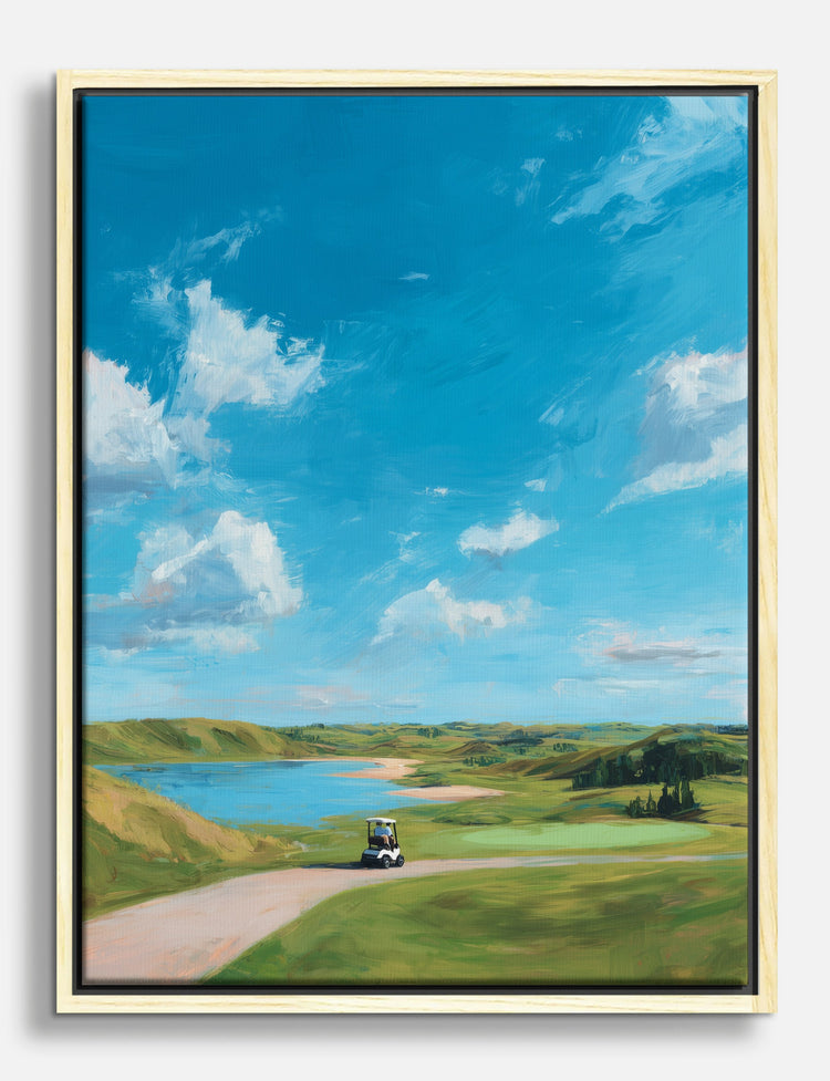Big sky, endless greens, and that unmistakable sense of possibility—bring the wide-open calm of the fairway right into your favorite room. This piece captures the fresh optimism of a morning on the links, with sweeping blue skies and soft, rolling hills that stretch as far as you can imagine.