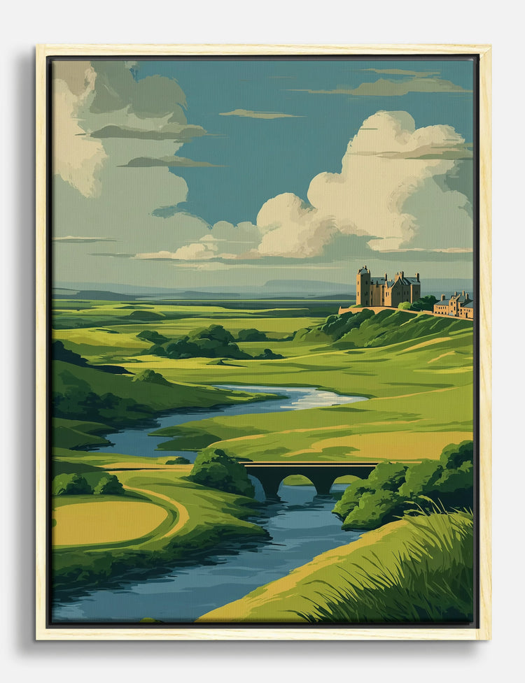 There’s a timeless magic in wide-open landscapes, and this piece brings it right into your home. Gentle greens and golden fields stretch toward a distant castle, inviting you to slow down and savor the view. The winding river and arched stone bridge add a touch of storybook charm—perfect for sparking a sense of calm and wonder every time you glance its way.