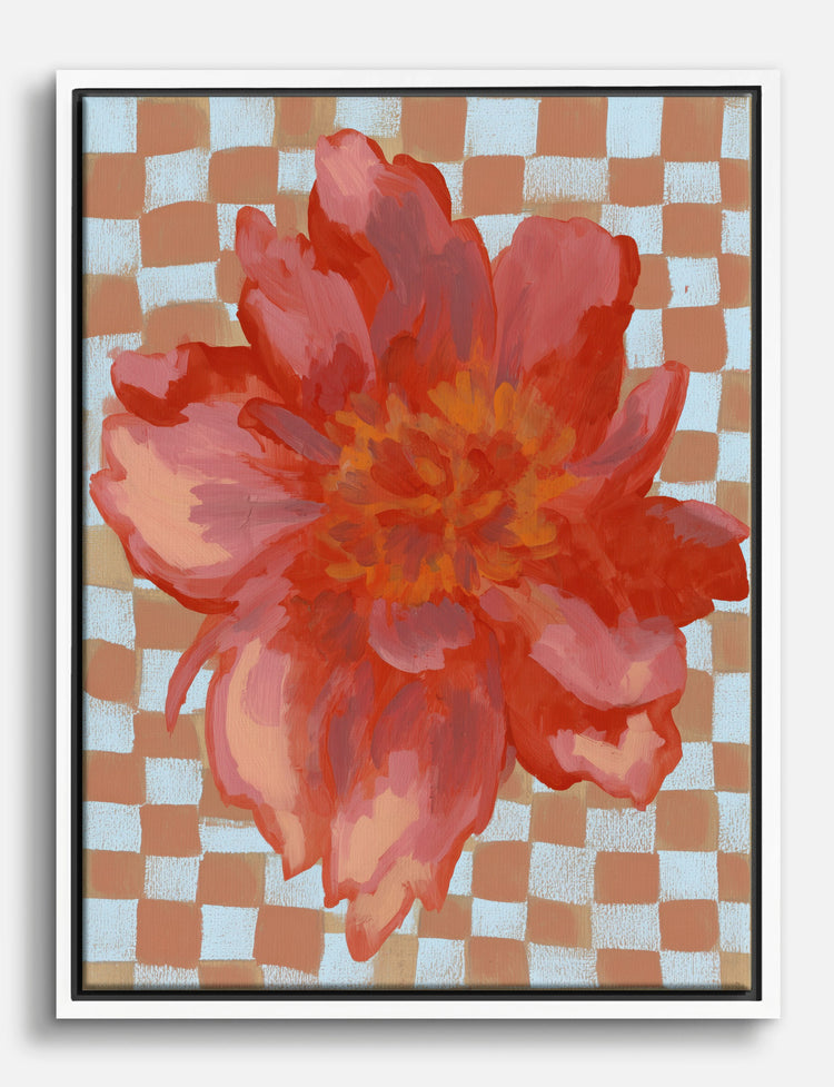 A single bold bloom takes center stage, bursting with vibrant reds and oranges against a playful checkered backdrop. This piece instantly energizes any room, bringing warmth and a pop of personality wherever it hangs.