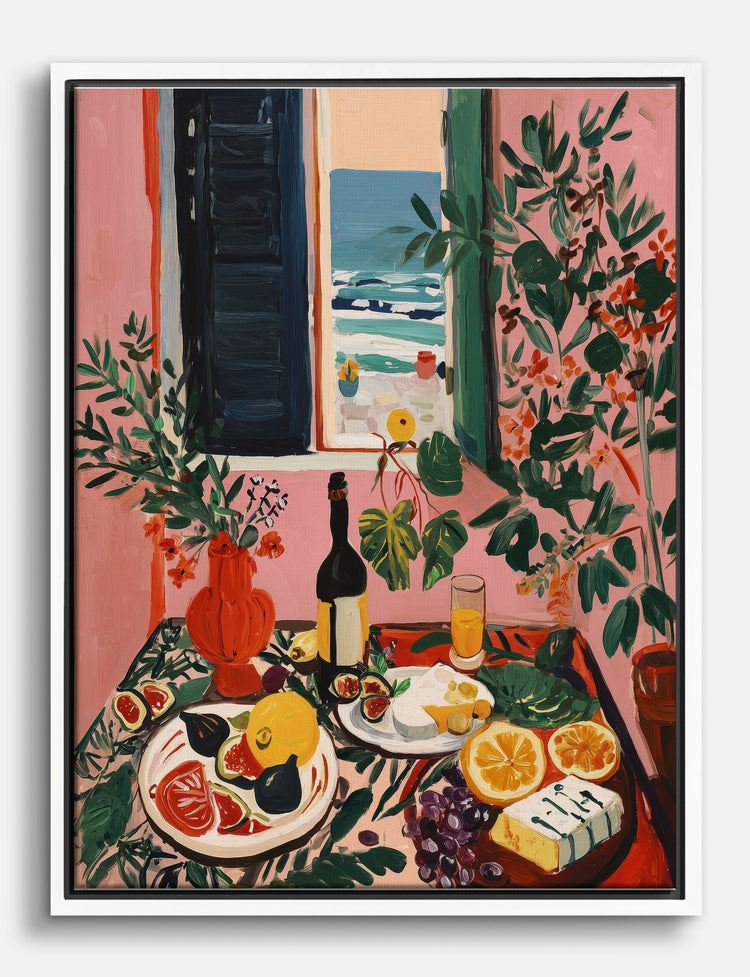 Wake up your walls with a burst of Mediterranean sunshine. This vibrant scene invites you straight to a sunlit table overlooking the waves, where fresh fruit, wine, and lush greenery set a mood that’s both relaxed and utterly chic.