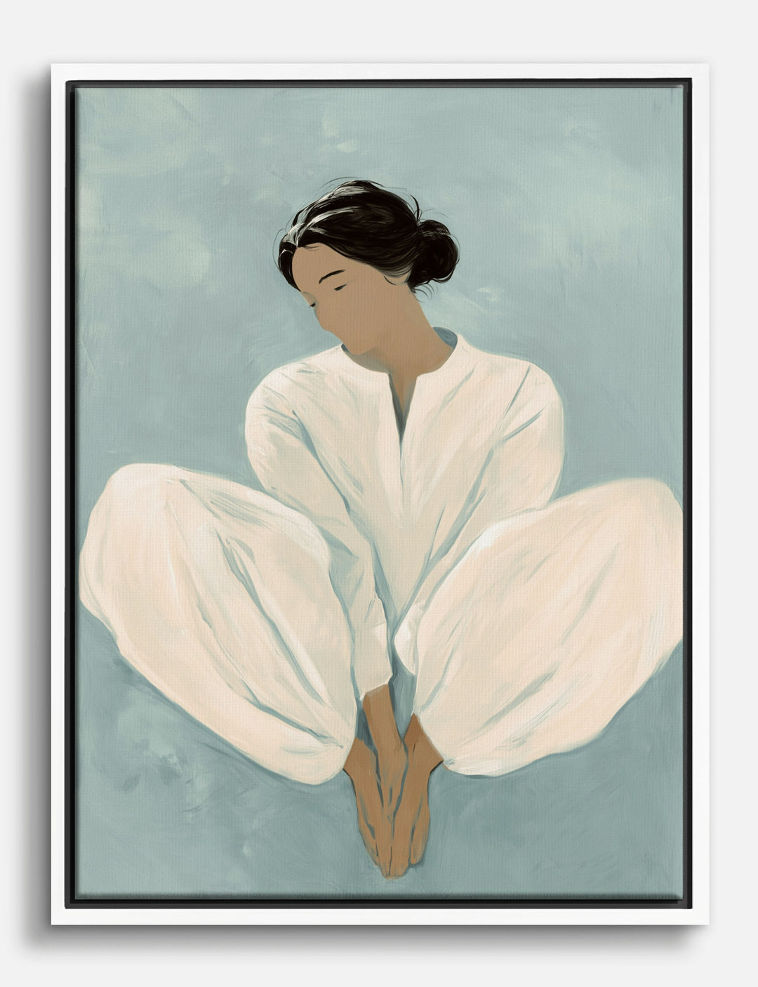 Soft curves and tranquil hues invite you to slow down every time you glance at this piece. The gentle, faceless figure, dressed in flowing white, radiates calm and quiet confidence—perfect for creating a peaceful sanctuary in your home.