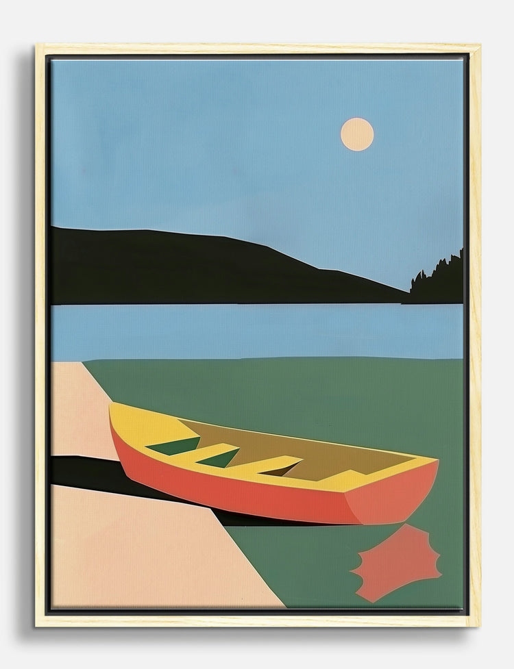 Picture this: a tranquil boat resting on a serene lake under a gentle sun. This artwork invites calm and serenity into your home, making it perfect for your bedroom or living room. Its soothing palette of blue and green effortlessly blends with various decor styles, bringing a touch of natures tranquility indoors. Let this piece transform your space into a peaceful retreat.