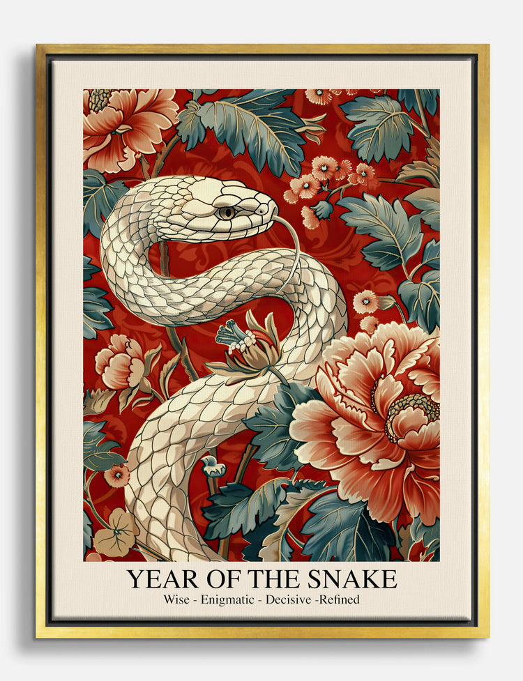 A coiled white snake glides through lush florals on a rich red backdrop, instantly adding a sense of mystery and refinement to your space. This piece radiates wisdom and quiet confidence, making it a striking focal point for your living room or bedroom.