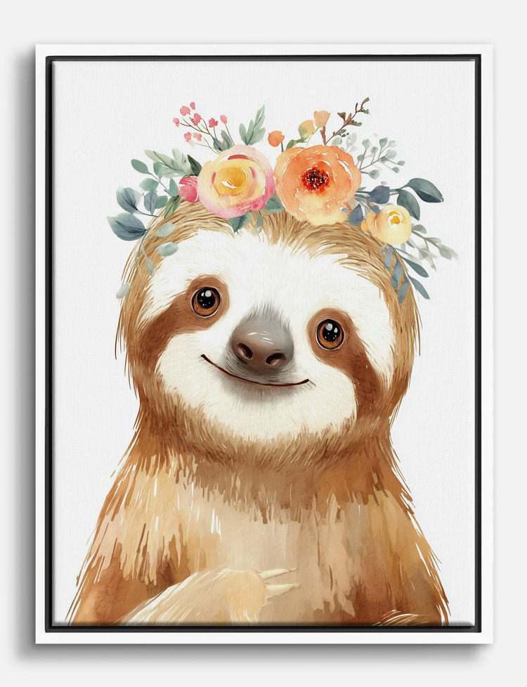Who says style cant be playful? This adorable sloth, crowned with a bouquet of watercolor blooms, brings instant cheer and a gentle, welcoming vibe to your space. Perfect for brightening up a nursery or adding a touch of personality to your bedroom, its warm browns and soft pastels complement both modern and boho decor.
