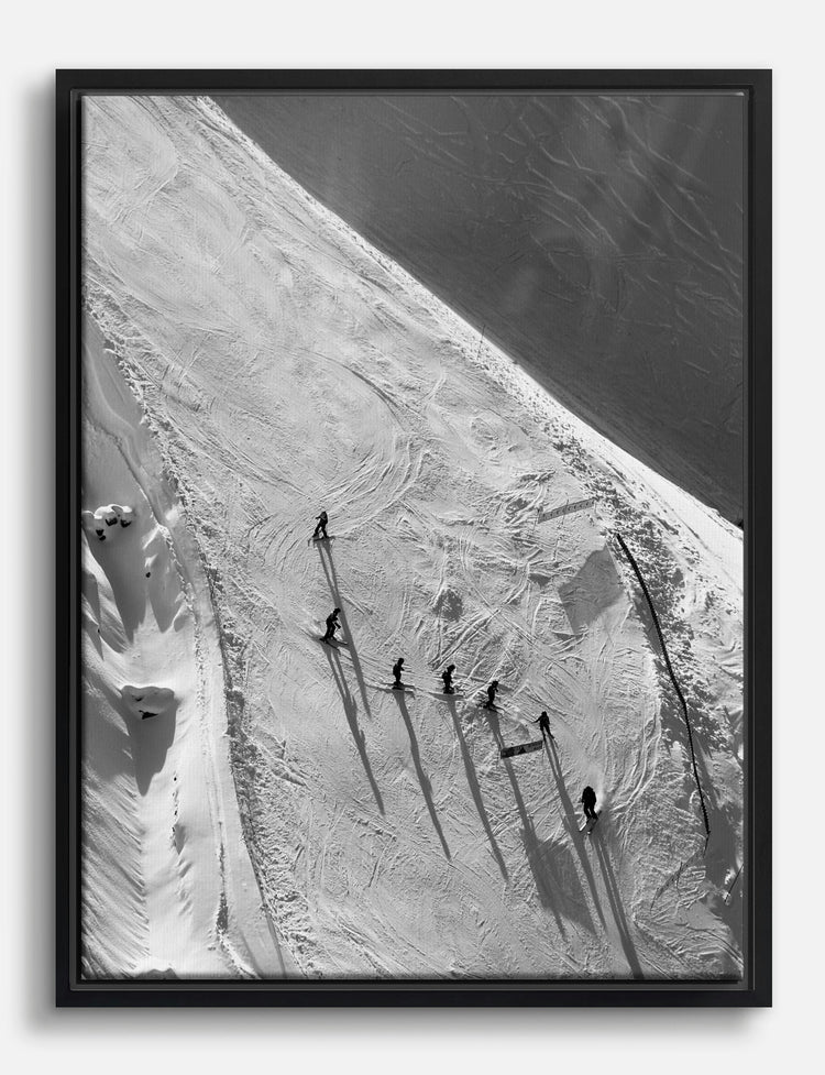 Bold lines and long shadows capture the crisp energy of a winter adventure in this striking black-and-white photograph. The scene is alive with motion—skiers carving their way up the slope, each figure casting a dramatic silhouette on the untouched snow.