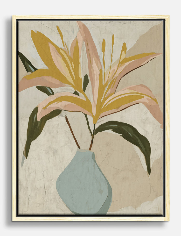A gentle bouquet of lilies brings a burst of calm to your space, blending blush pinks and golden yellows in a way that feels both fresh and timeless. This piece instantly softens any room, offering a quiet elegance that’s never fussy.