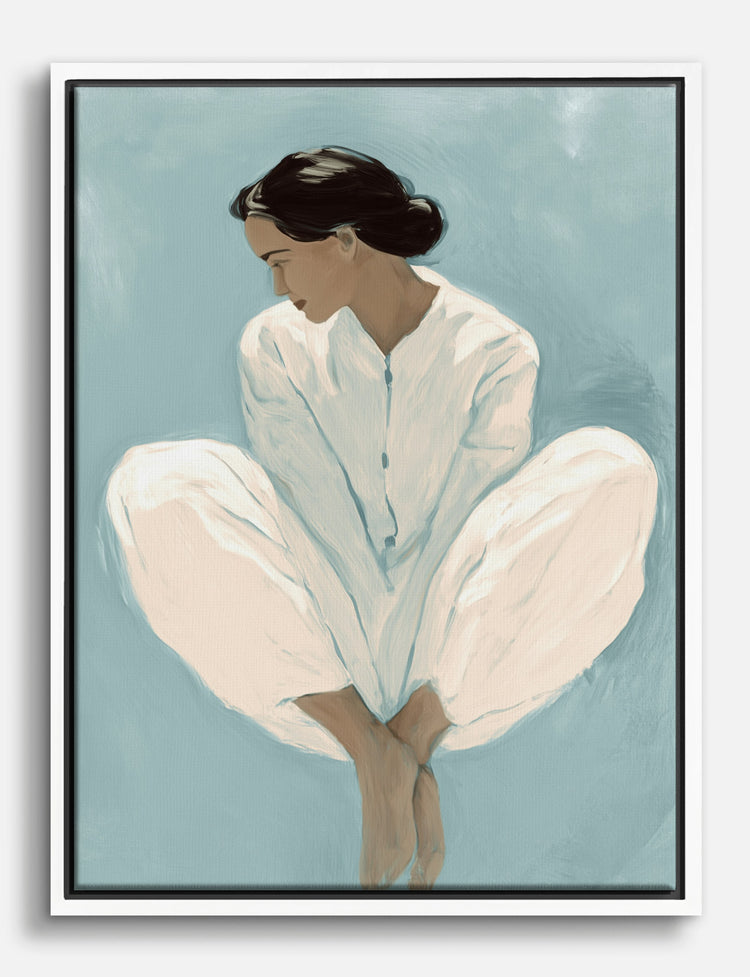 With gentle lines and a soothing palette, this portrait captures a moment of quiet introspection. The figure, curled up in cozy whites against a wash of tranquil blue, invites a sense of calm into your space.