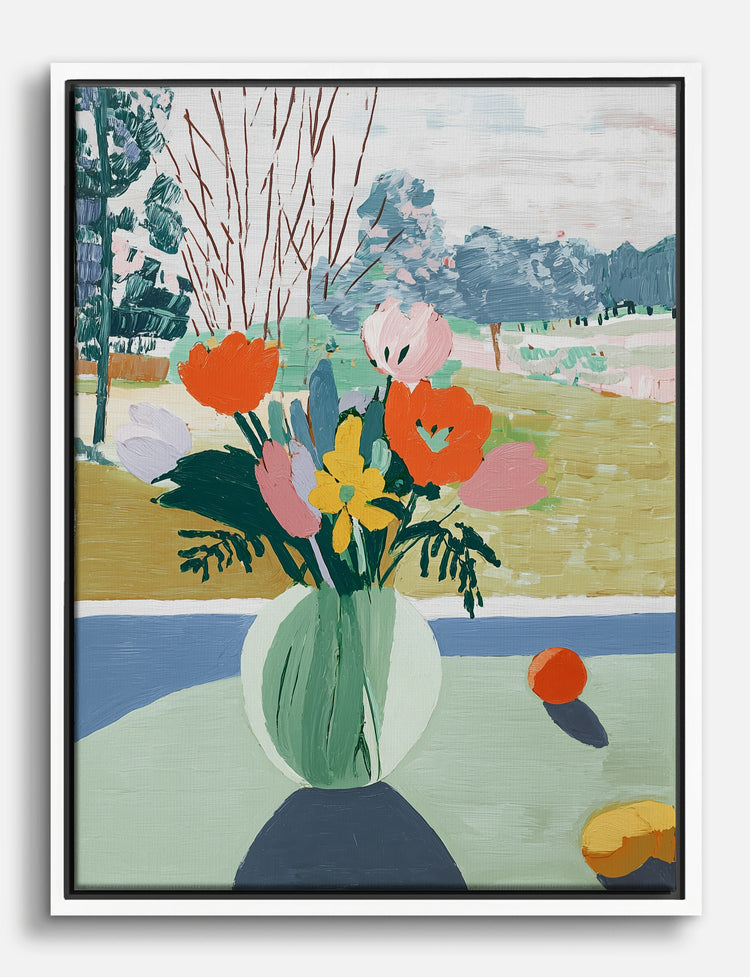 Bright pops of coral, pink, and yellow instantly energize your space with this cheerful bouquet scene. Each brushstroke feels like a breath of fresh air, inviting nature’s beauty right into your home.