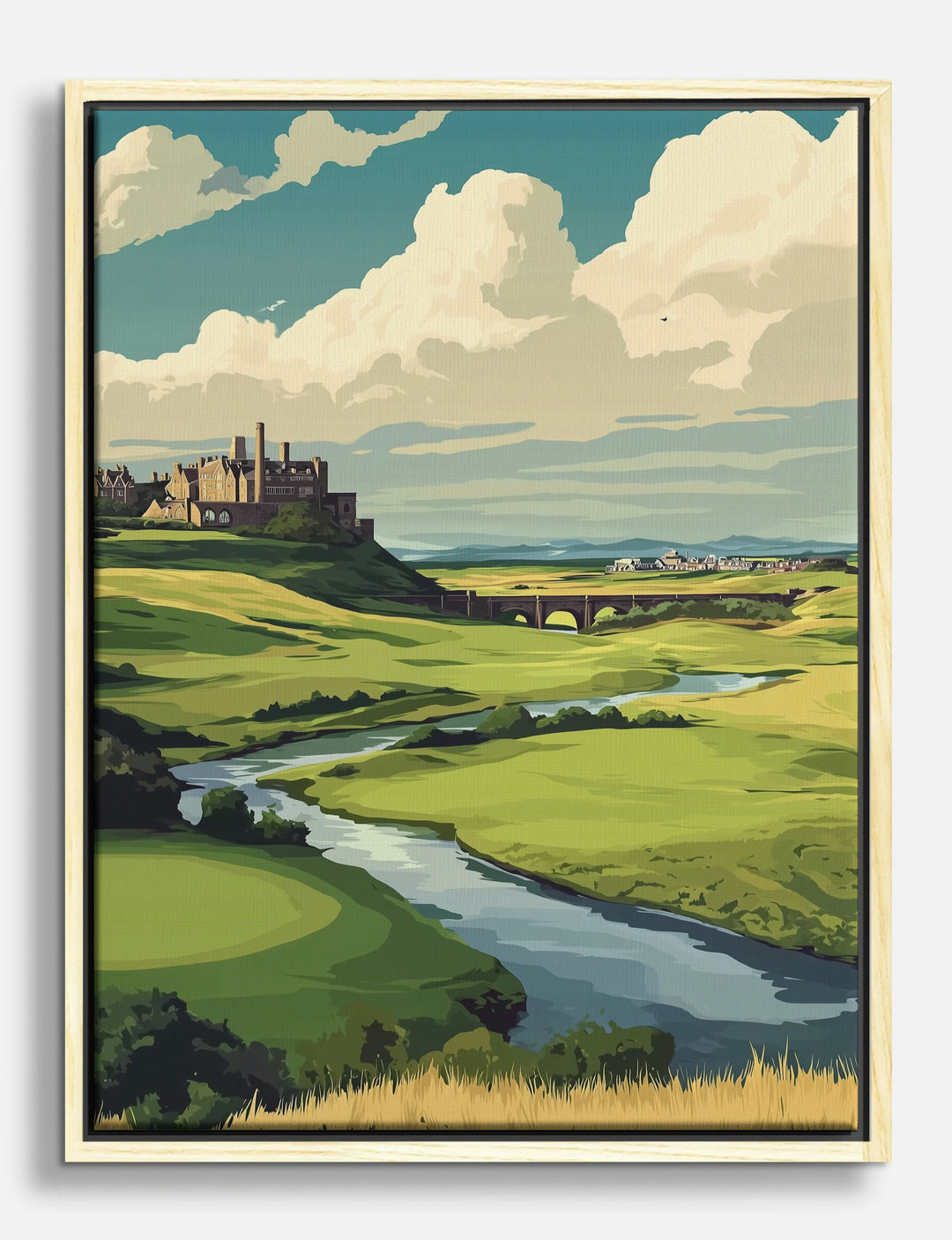 Rolling hills and sunlit fields invite you to lose yourself in this sweeping landscape. The scene captures the tranquil beauty of the countryside, with a majestic castle perched in the distance and a gentle river winding through lush greens.