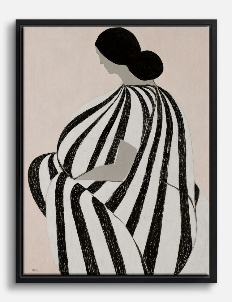 Bold stripes meet gentle curves in this striking piece, turning a simple moment into pure visual poetry. The soft contrast of black and white draws you in, giving your space a sense of calm sophistication.