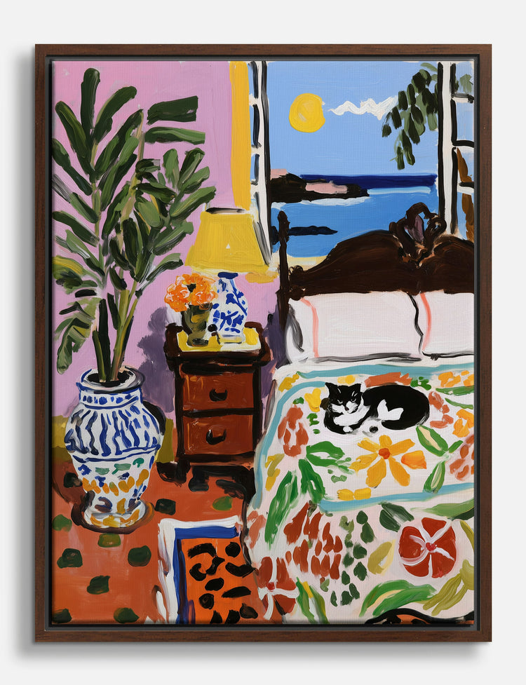 Step into a world where every morning feels like a fresh start. This vibrant piece pops with color and warmth, capturing the charm of a sun-kissed bedroom and the cozy companionship of a curled-up cat. The playful patterns and lush greenery bring a touch of the tropics right to your walls, while the open window invites in endless possibility.