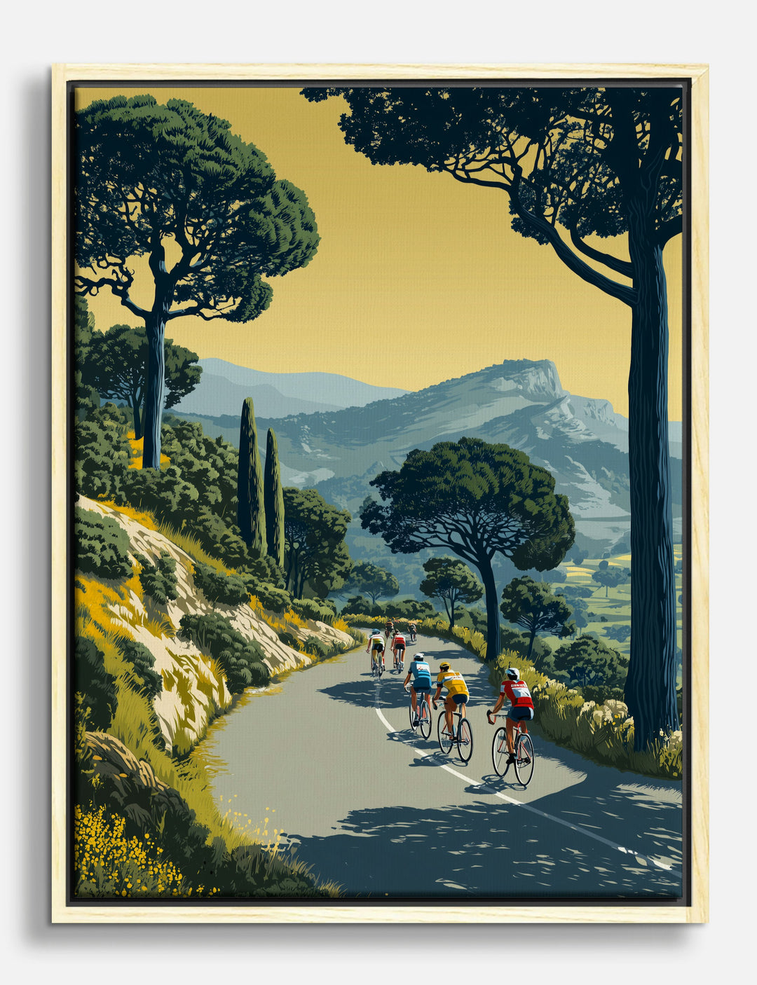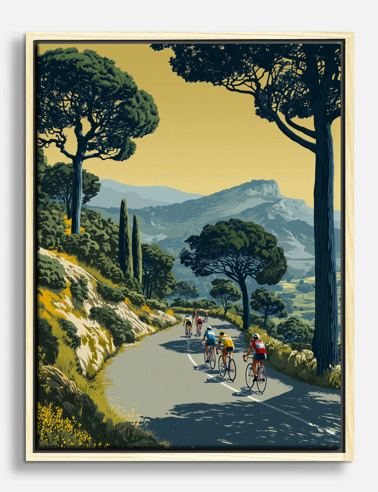 Adventure is just around the bend with this vibrant scene of cyclists winding through sun-drenched hills. The golden sky and lush greenery instantly energize your space, bringing a sense of movement and fresh air indoors. Perfect for your living room or home office, this piece invites you to celebrate freedom, resilience, and the simple joy of the open road—no helmet required. Whether your style leans modern or eclectic, the warm yellows and cool greens play beautifully with a range of decor, adding a pop of color and a dash of wanderlust. Make your walls a window to adventure—you’ll feel inspired every time you pass by.