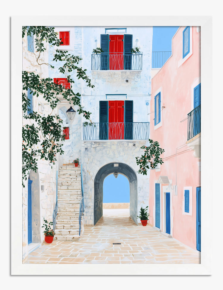 There’s something magical about the way sunlight plays across whitewashed walls and vibrant red doors. This piece captures the breezy charm of a quiet Mediterranean alley, inviting warmth and wanderlust into your home.