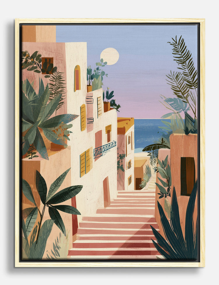 Step into a sun-kissed escape every time you glance at your wall. Warm blush and terracotta tones wrap your space in the laid-back charm of a coastal village, where lush greenery peeks from every corner and the sea calls from the horizon.