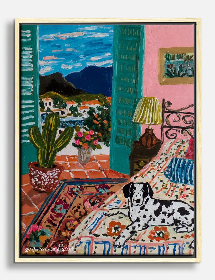 Step into a slice of everyday joy—where crisp turquoise shutters frame a sun-soaked view, and a playful Dalmatian finds its place on a patterned quilt. This piece radiates warmth and easygoing charm, turning any room into a personal escape.
