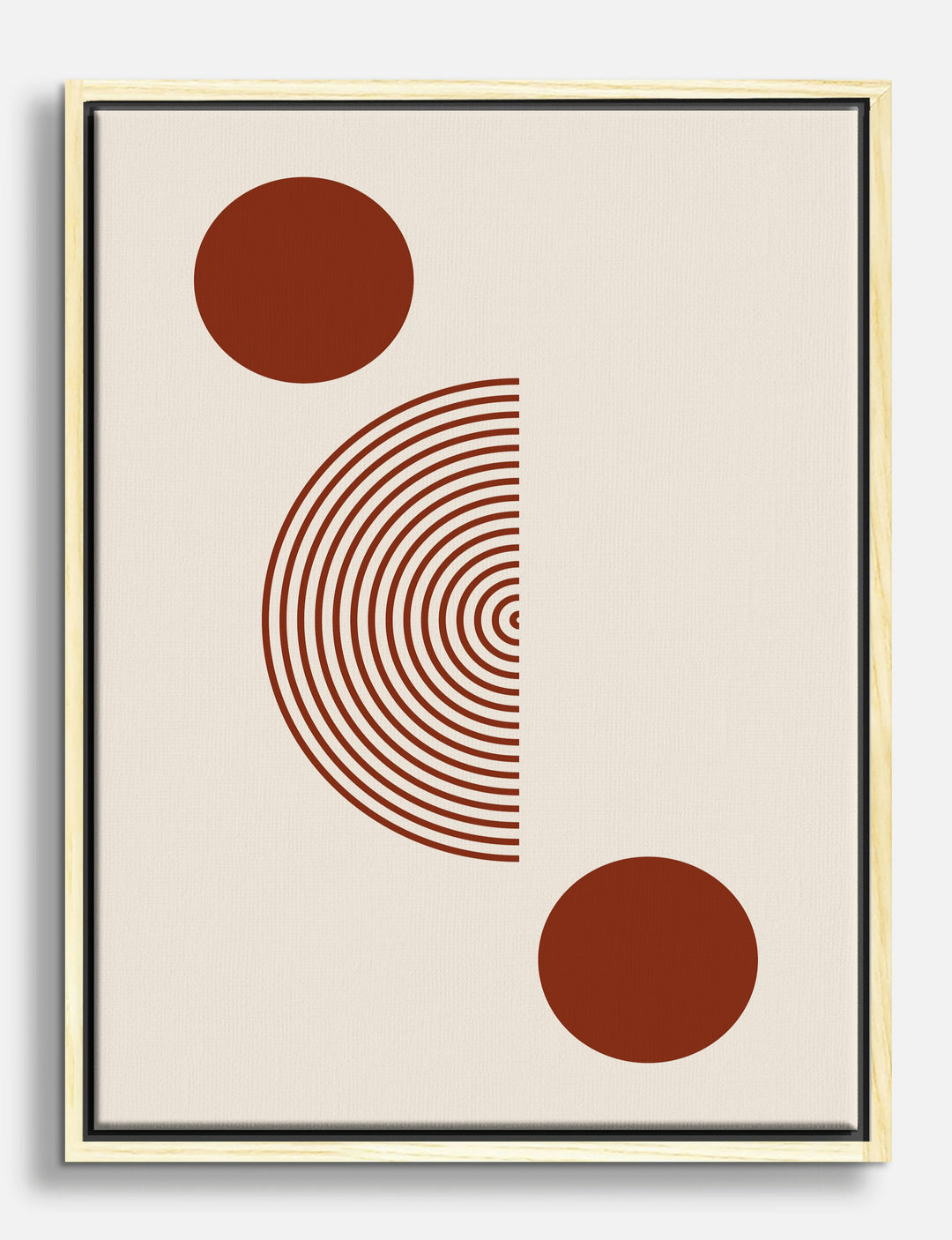 Bold symmetry meets warm earthiness in this striking abstract. Two deep red circles and a cascade of concentric arcs create a modern statement that feels both grounded and effortlessly chic.
