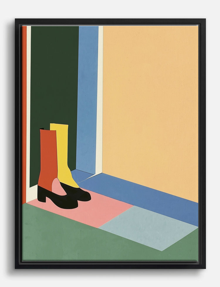 Bold colors and playful shapes make this piece a joyful addition to your space. Perfect for an entryway or living room, its vibrant palette of yellow, pink, and green boots against geometric patterns adds a touch of whimsy and style. Youll love how effortlessly it complements modern decor, inviting creativity and conversation.
