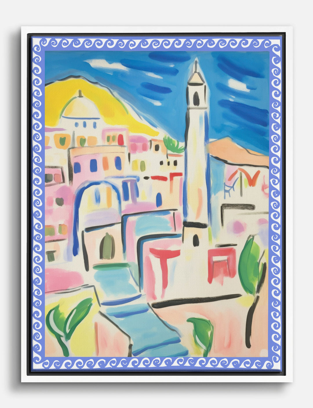 Dive into the vibrant charm of Santorini with this lively piece. Bursting with color, it captures the essence of a sunlit Greek village, making it the perfect addition to your living room or bedroom. The playful palette complements various decor styles, transforming your space into a joyful retreat. With this artwork, youll feel the pride of curating a home thats uniquely yours, effortlessly stylish and full of life.