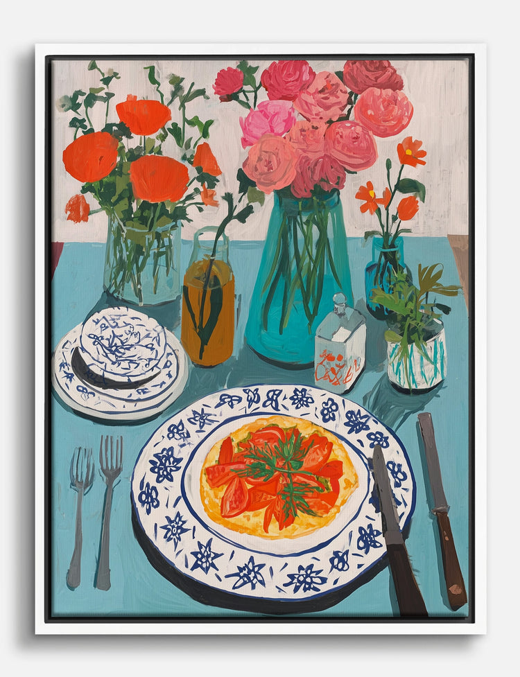 A burst of color, a celebration of everyday beauty—this piece brings the joy of a sunlit brunch straight to your walls. Youll feel like youre sitting at a lively table, surrounded by fresh blooms and delicious fare, every time you walk by.