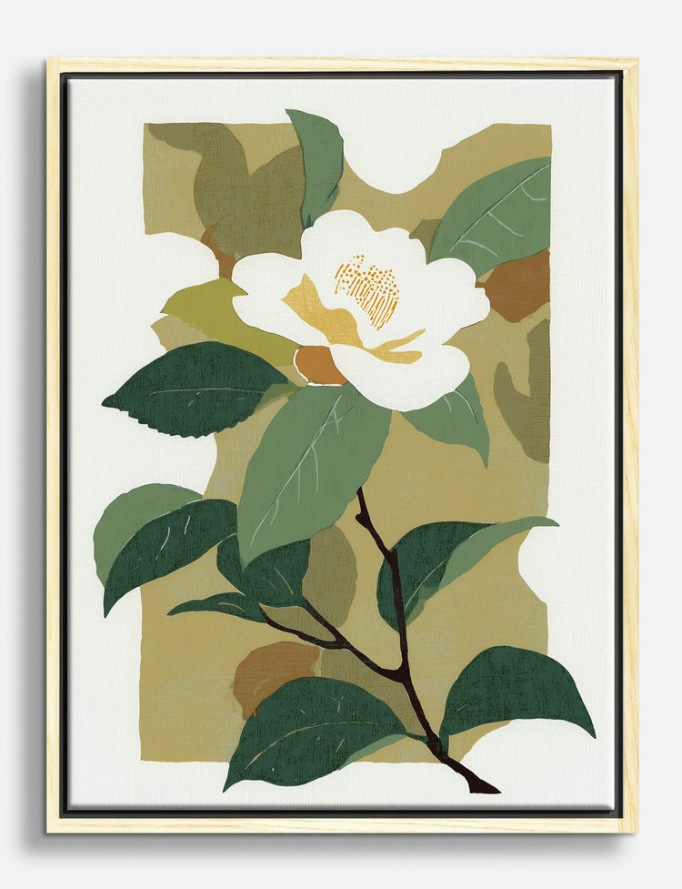 Fresh and tranquil, this botanical beauty brings a breath of calm to any room. The creamy white camellia, set against lush green leaves and earthy tones, instantly softens your space while adding a touch of refined charm.