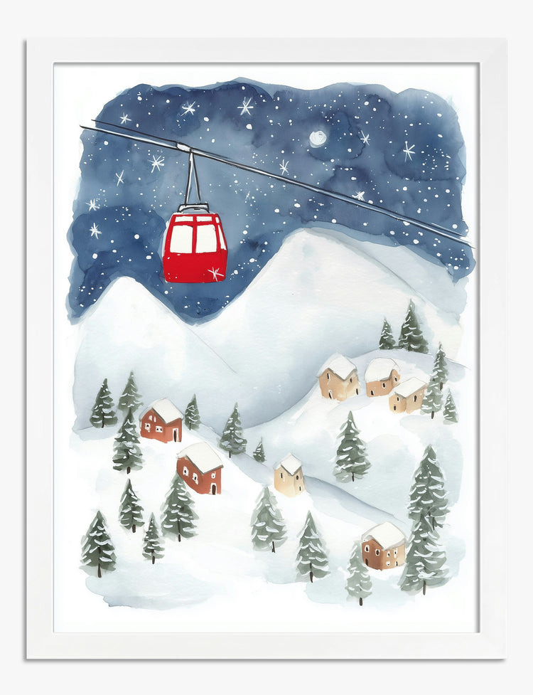 A snowy night, twinkling stars, and a cozy village tucked beneath the mountains — this piece instantly transports you to a peaceful winter wonderland. The vibrant red cable car pops against soft snowy whites and midnight blues, giving your space a burst of seasonal charm and nostalgia.