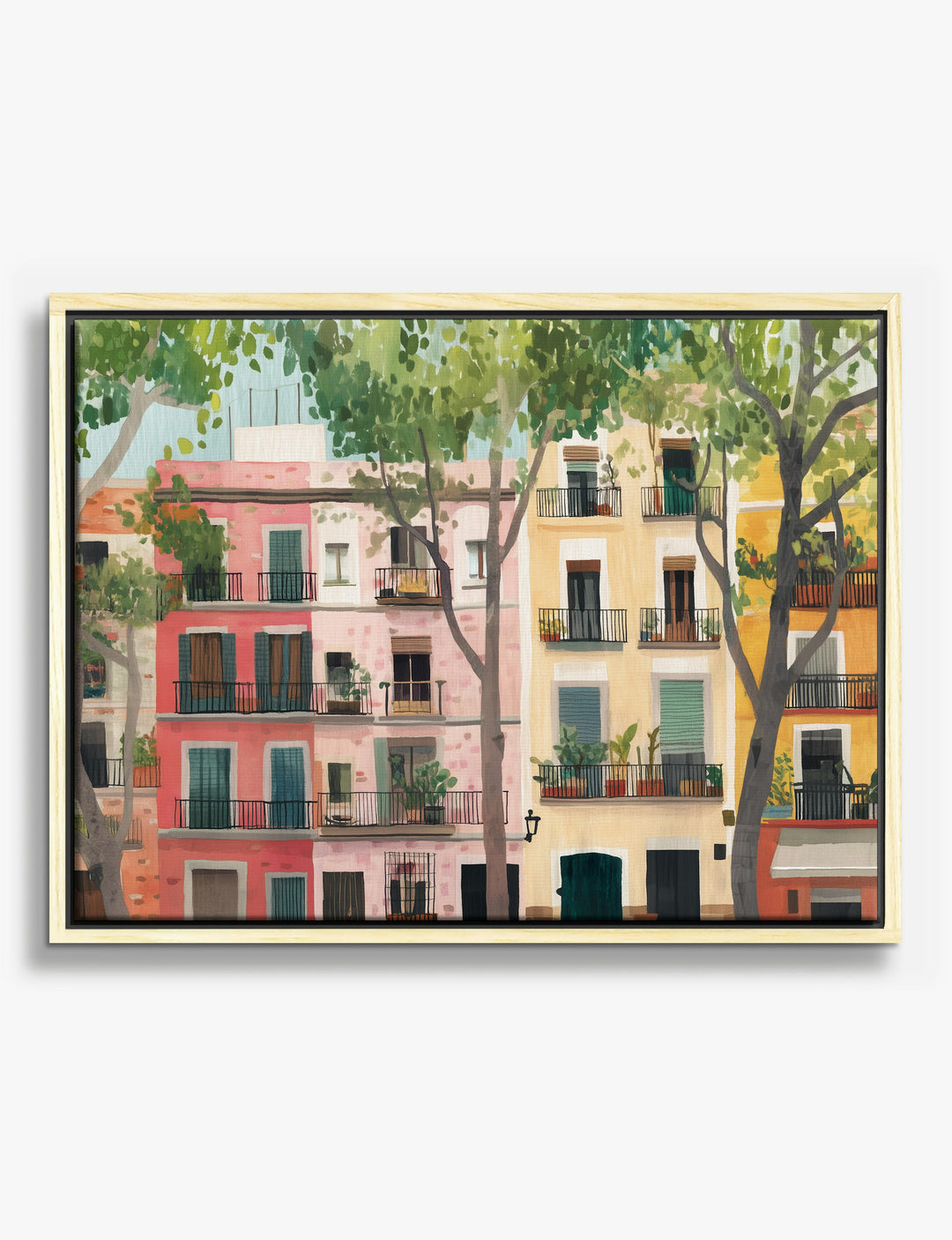 Sun-soaked facades and leafy shade set the stage for effortless European style. This vibrant cityscape channels the laid-back spirit of Barcelona, bringing a pop of Mediterranean color and charm to your walls. Let your living room or entryway capture the feeling of a carefree afternoon stroll through winding Spanish streets. The playful mix of pinks, yellows, and greens makes it easy to pair with both modern and boho decor — instantly brightening any space. You deserve art that feels both personal and inviting. This piece is your ticket to a home that radiates warmth, personality, and a hint of wanderlust, all without leaving your favorite chair.