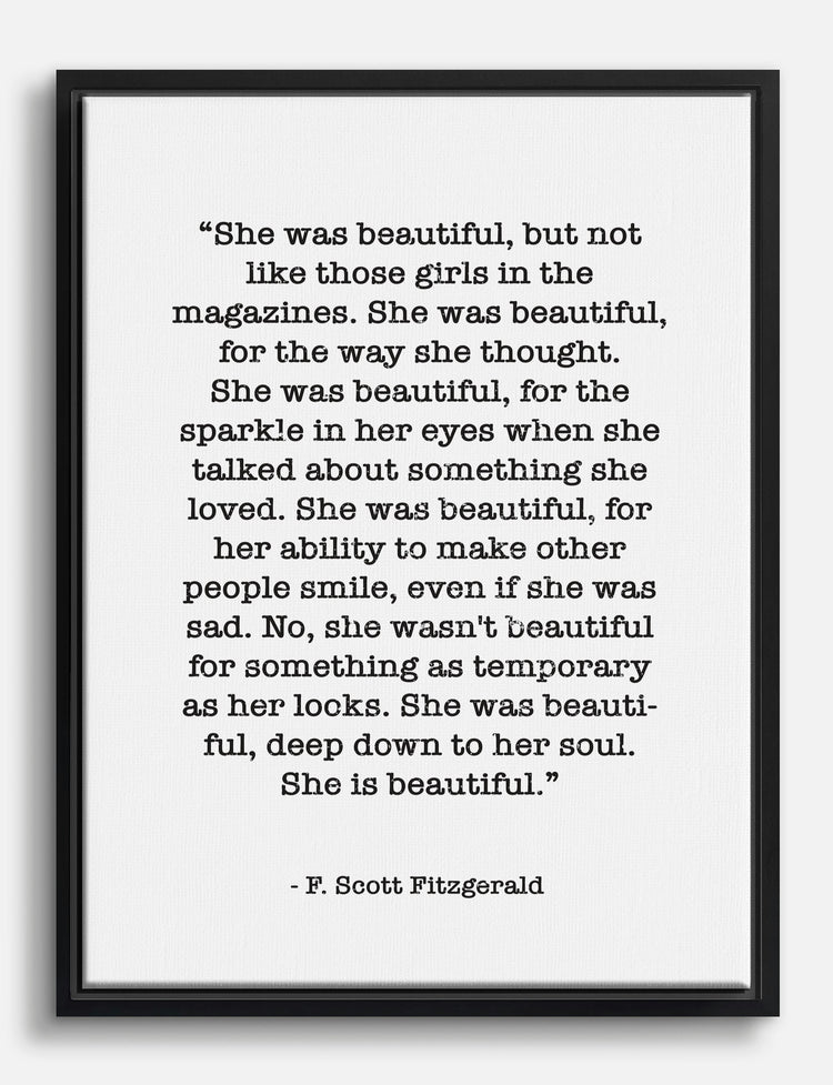 Celebrate the beauty that goes beyond the surface with this inspiring quote by F. Scott Fitzgerald. Perfect for your bedroom or office, it invites a sense of introspective elegance and warmth. The monochrome palette effortlessly complements any decor, adding a touch of thoughtful style to your space. Let this piece remind you of the depth and soulfulness that make life truly beautiful.