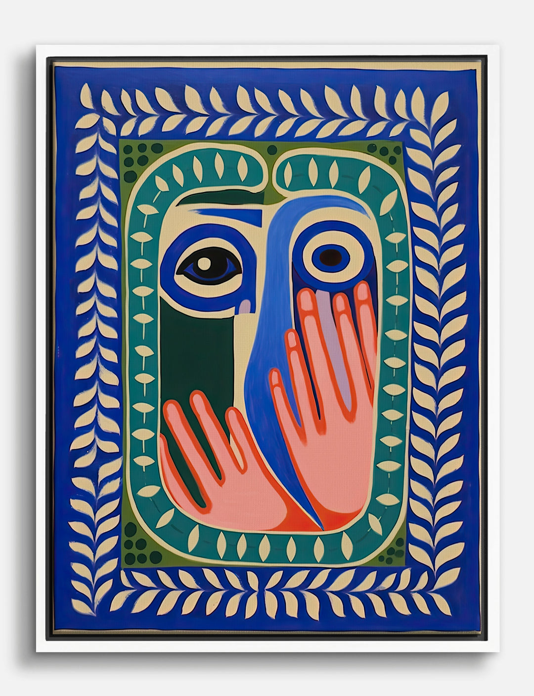 This piece is pure personality—vivid shapes and playful hands meet a gaze that’s impossible to ignore. It’s the kind of artwork that instantly energizes your space and invites conversation, all while feeling approachable and fun.