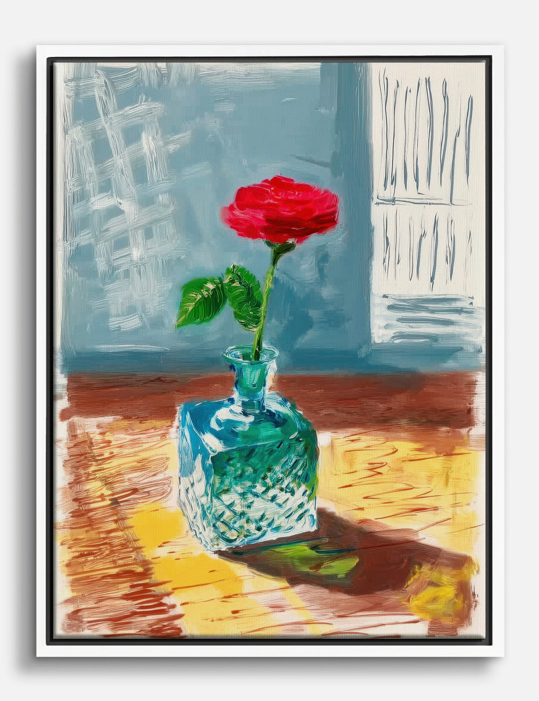 A single red rose standing tall in a textured glass vase — it’s a pop of confidence you can add to any wall. This piece instantly energizes your space, inviting a little romance and a lot of style.
