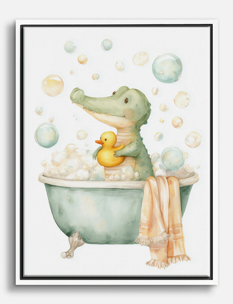 A crocodile in a vintage tub, clutching a rubber duck, surrounded by cheerful bubbles—this print instantly adds a playful spark to your space. It’s the kind of art that brings a smile to your face and warmth to your heart, perfect for creating a cozy, joyful vibe.
