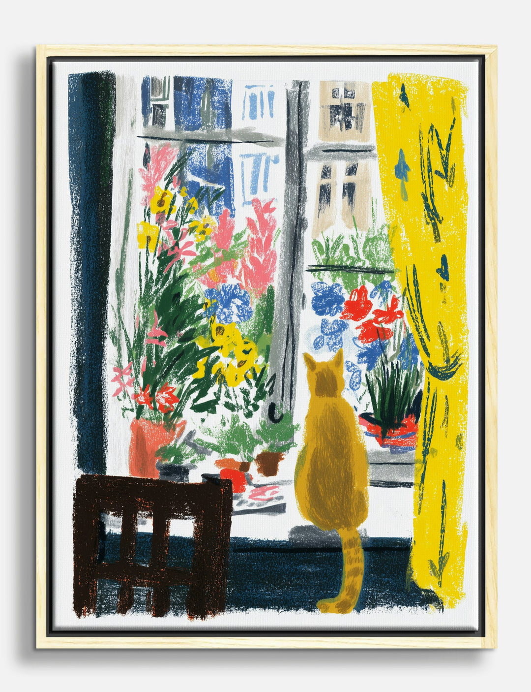 A golden afternoon, a curious cat, and a window bursting with life—this piece brings the outside in with a flourish of color and charm. Imagine sipping your morning coffee while a sunlit feline companion keeps watch over a lush city garden.
