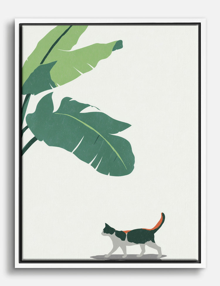 A leafy escape meets feline curiosity in this effortlessly cool piece. Lush green banana leaves arch overhead while a cat strolls below—bringing a sense of calm adventure right into your home.