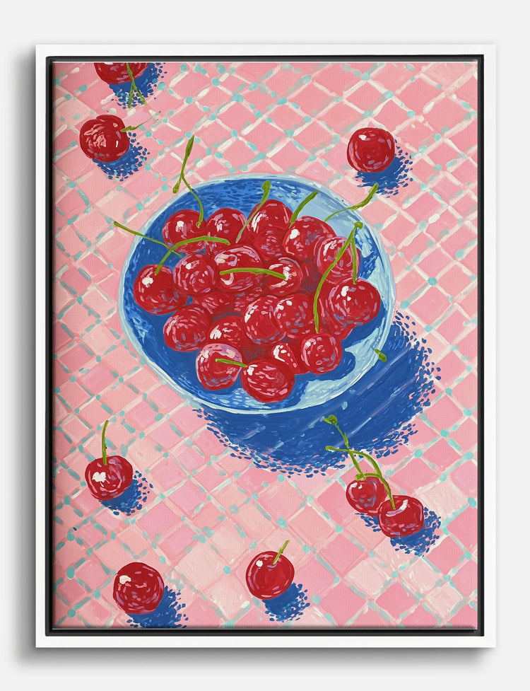 A bowl of cherries never looked so inviting. Bursting with juicy reds and playful textures, this piece instantly energizes your space. Picture it above your kitchen table or brightening a cozy corner—it’s all about sparking a sense of cheerful abundance.