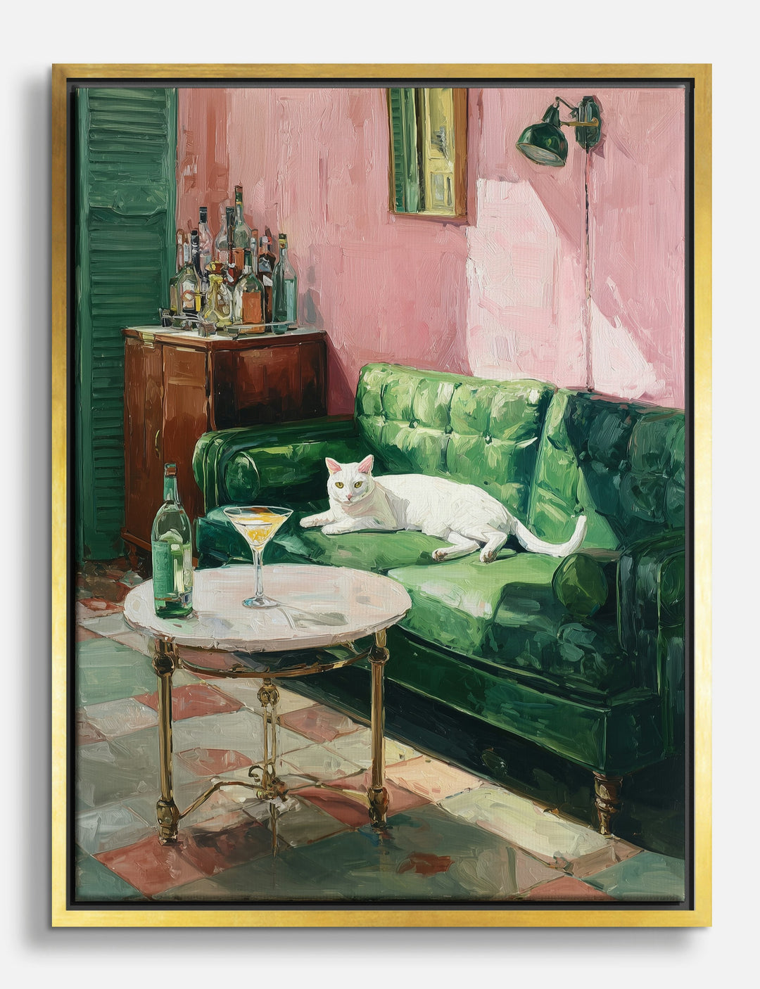 A white cat lounges on a lush green sofa, basking in the afternoon light—talk about effortless cool. This piece instantly brings a sense of relaxed sophistication to your space, perfect for anyone who loves a touch of retro charm with their downtime.