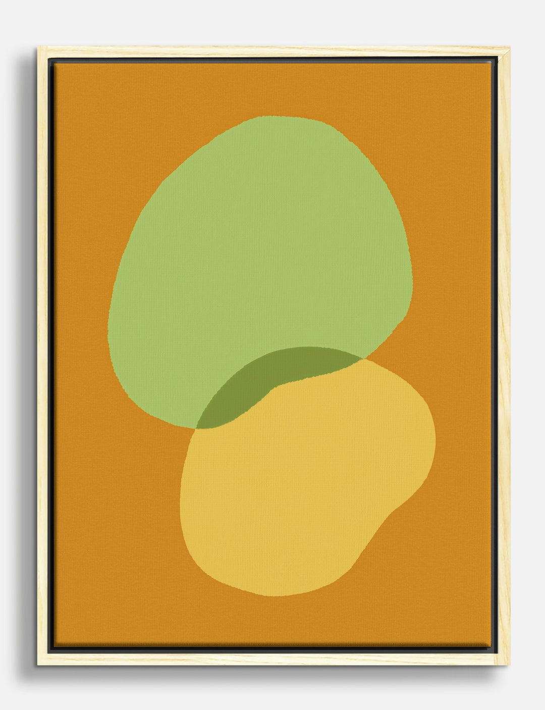Two bold, organic shapes—one soft green, one mellow yellow—float together on a warm orange backdrop, radiating pure good vibes. This abstract piece is all about easygoing style and fresh energy, instantly brightening any space it touches.