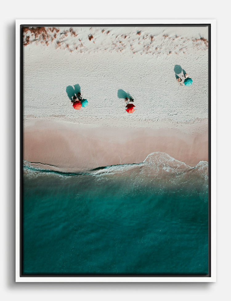 From above, the shoreline tells a story of sun, sand, and pure possibility. This art piece captures the carefree magic of a day by the sea—beachgoers dotted along soft sand, vibrant umbrellas casting playful shadows, and turquoise waves gently rolling in.