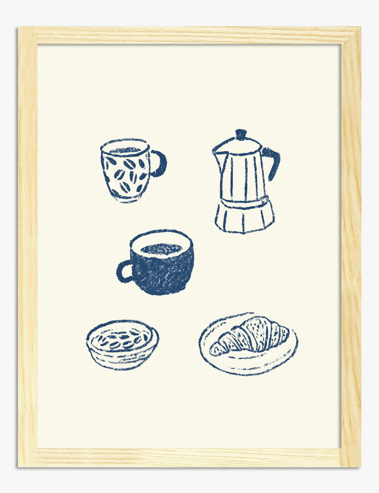 Start your day with a dash of charm — this playful illustration brings your favorite coffee moments to life. Two mugs, a classic moka pot, and tempting pastries evoke the warmth of a European café, right on your wall. This piece pops in kitchens and dining rooms, inviting you to savor slow mornings and afternoon breaks alike. The hand-drawn blue lines on a soft, neutral background lend a minimalist vibe that blends effortlessly with modern, Scandinavian, or vintage-inspired spaces. Let this art print be your daily reminder that joy is found in simple pleasures — and your home deserves to feel as welcoming as your first cup of coffee. Affordable, original, and easy to style, it’s the perfect way to add personality and pride to your favorite spot.