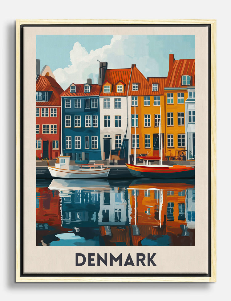 Step into a vibrant world with this charming depiction of Denmarks colorful harbor. The lively hues of orange, blue, and yellow create a joyful atmosphere that’s perfect for brightening up your living room or office. Let this piece transport you to a place of warmth and style, adding a touch of Scandinavian flair to your decor. Affordable elegance is just a frame away.