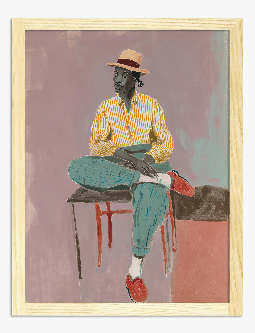Bold stripes meet relaxed confidence in this effortlessly stylish portrait. The scene radiates a sense of calm, with a figure lounging in vibrant, modern flair—think yellow pinstripes, teal trousers, and a straw hat with attitude. Let this piece bring a fresh pop of personality to your living room or office. The warm, earthy palette and soft background invite you to unwind, while the unexpected color combos make it easy to pair with both neutral and colorful decor. Youll love how this artwork instantly elevates your space, making it feel curated, expressive, and uniquely yours. With just one piece, your room goes from everyday to inspired—because great style should always feel this easy.