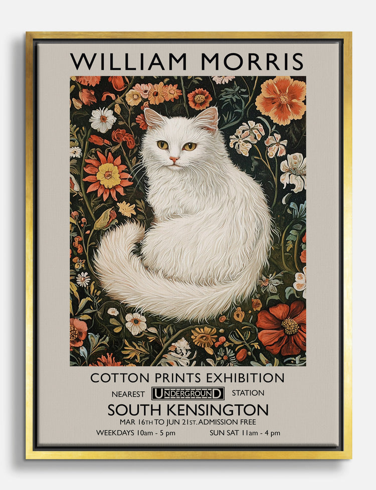 Nestle into timeless elegance with this William Morris-inspired piece. The charming white cat surrounded by lush florals brings a touch of vintage sophistication to your space. Perfect for your living room or bedroom, this artwork adds warmth and character, effortlessly complementing both modern and classic decor styles. Transform your home into a haven of style and grace.