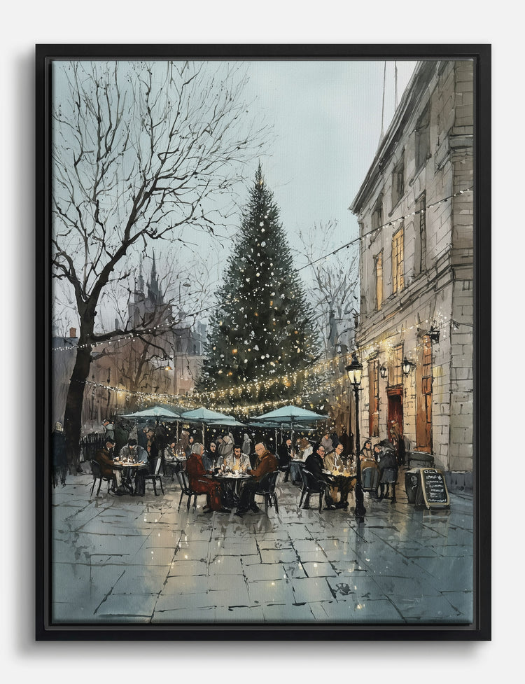 There’s a certain magic in city lights reflecting off rain-soaked streets, and this piece brings that cozy, festive glow right into your home. You’ll feel transported to a charming London square, where friends gather under twinkling fairy lights and the towering Christmas tree sets the scene for joyful connection.
