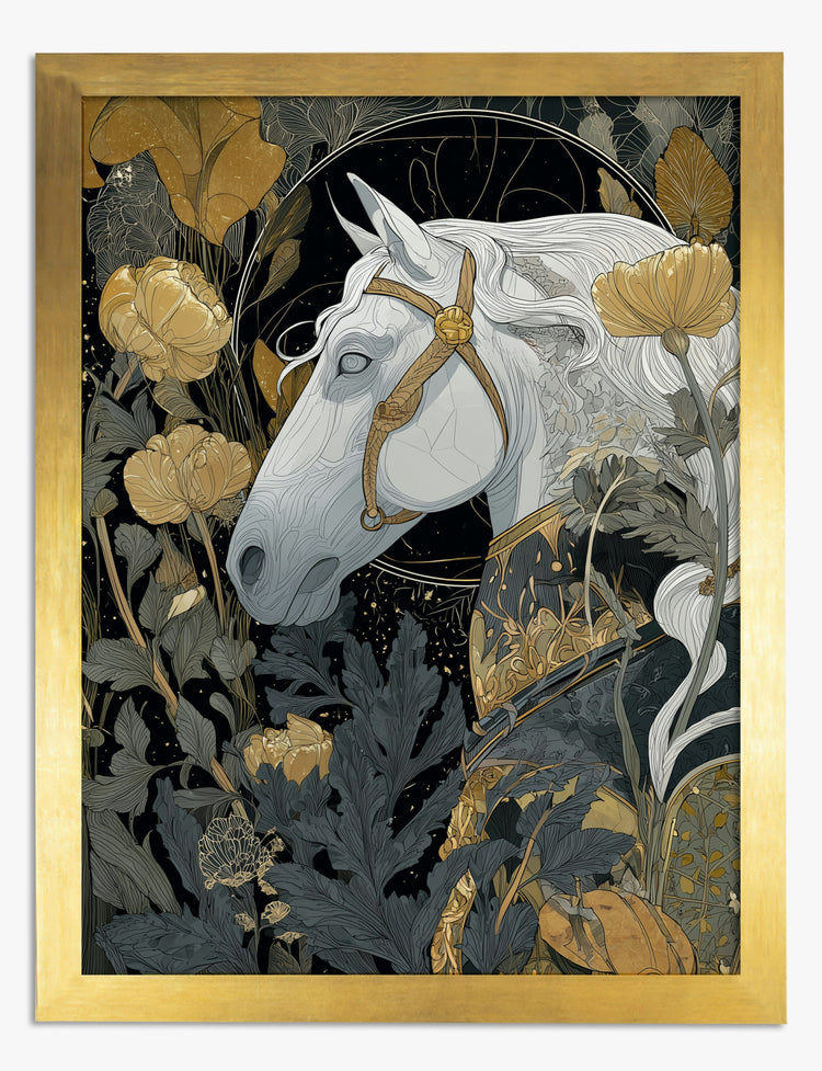 A white horse emerges from a sea of gold and midnight botanicals, inviting a sense of calm wonder into your space. There’s something quietly powerful about its gaze—like a trusted companion standing guard over your home’s most creative corners. This piece is pure magic for anyone craving a touch of elegance and intrigue. The muted golds and deep charcoals play beautifully with both modern and vintage decor, offering a statement that feels at once bold and harmonious. Perfect for your living room or bedroom, it’s the kind of artwork that starts conversations and inspires daydreams. Let it remind you every day that your home can be as unique and expressive as you are—no renovation required. Bring home this extraordinary beauty and give your walls a story worth telling.